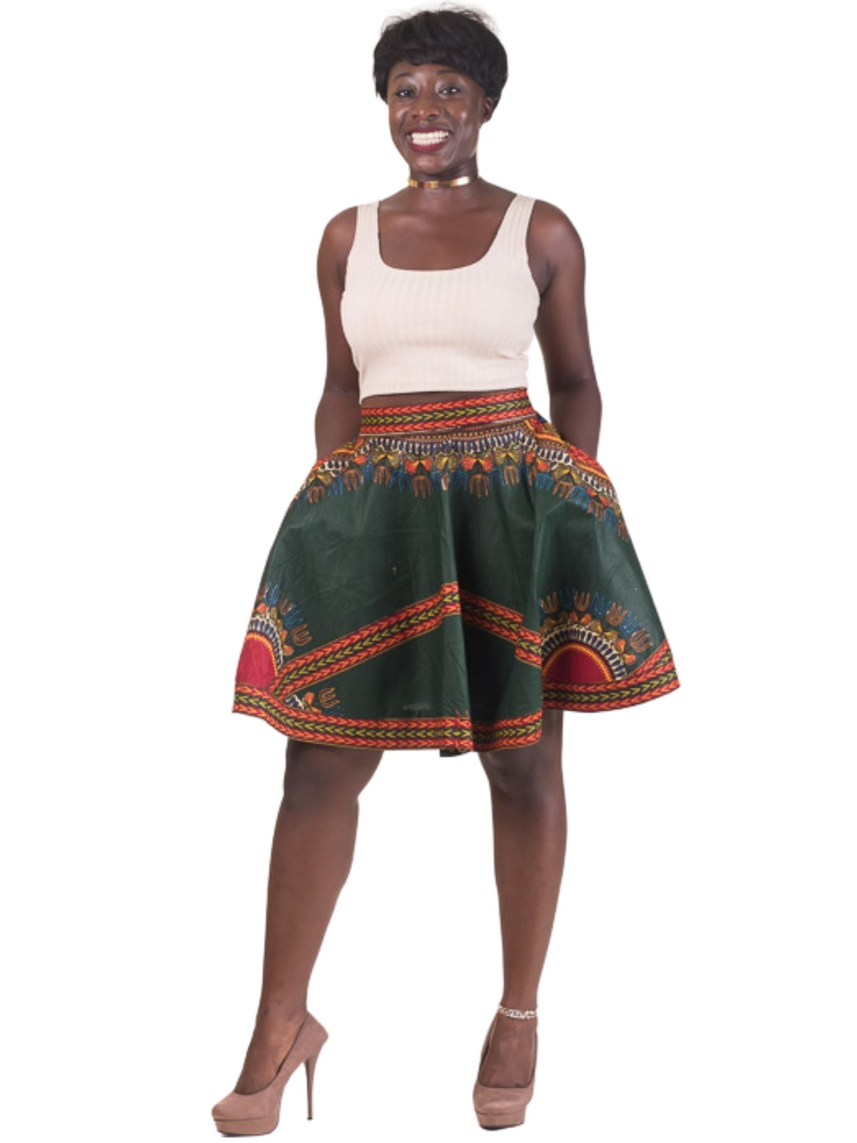 Beautiful skater skirt, made with high quality Dashiki fabric from Ghana. 2inch waist band, 2 inside pockets, and a heavy duty zipper. Lands right above the knee. Sexy enough to wear home for a flirty day.