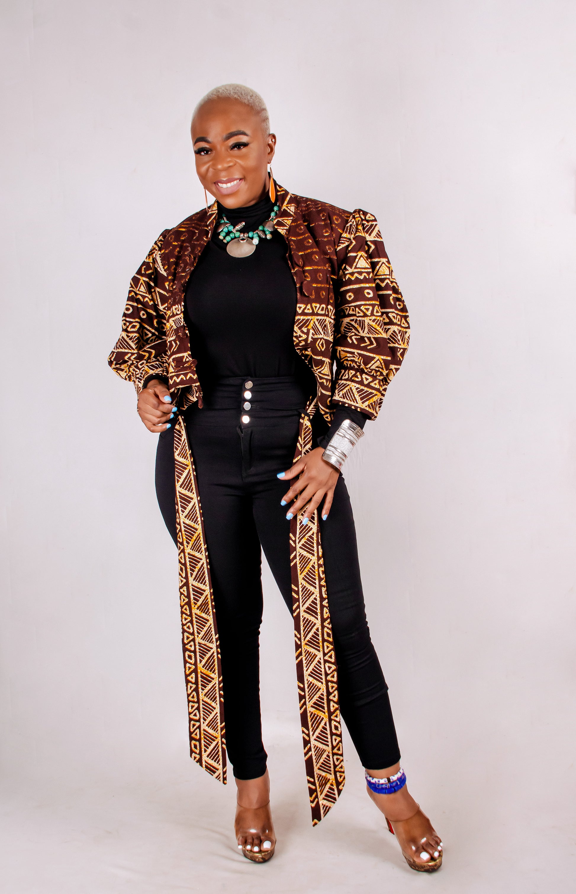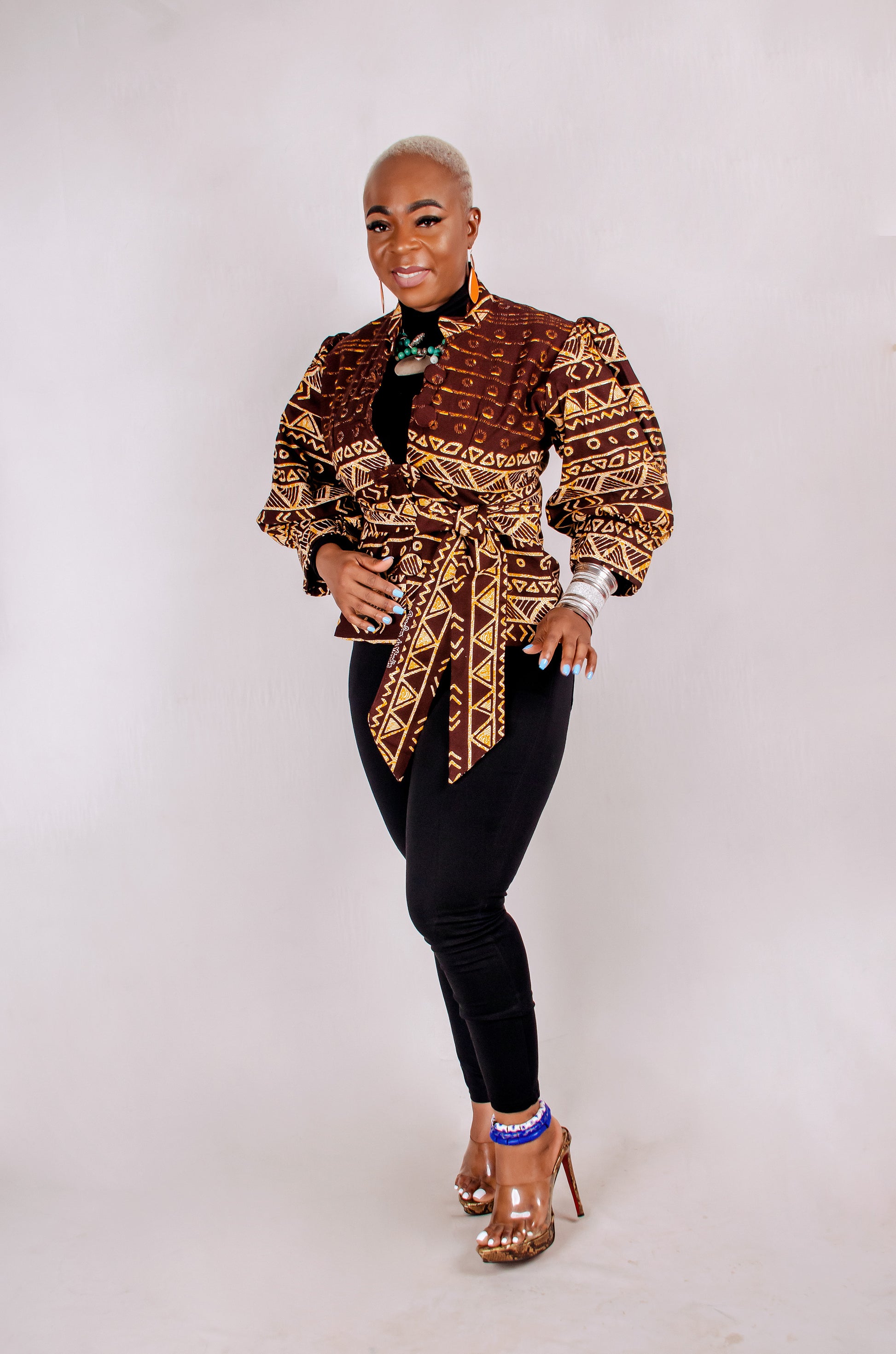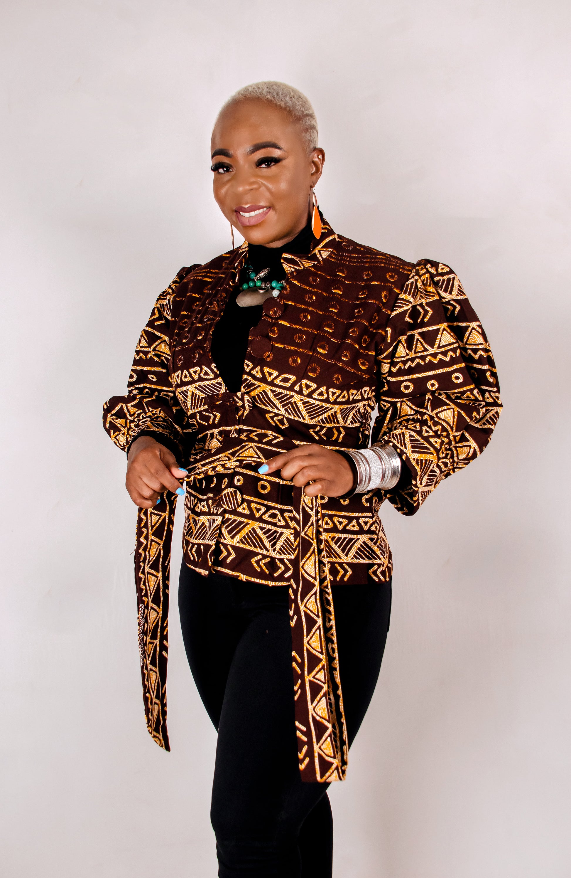 Gorgeous puffy sleeves jacket. Made with high quality woodin print, fully linned with a belt to help snatch that waist. Rock it with skinny leg pants.