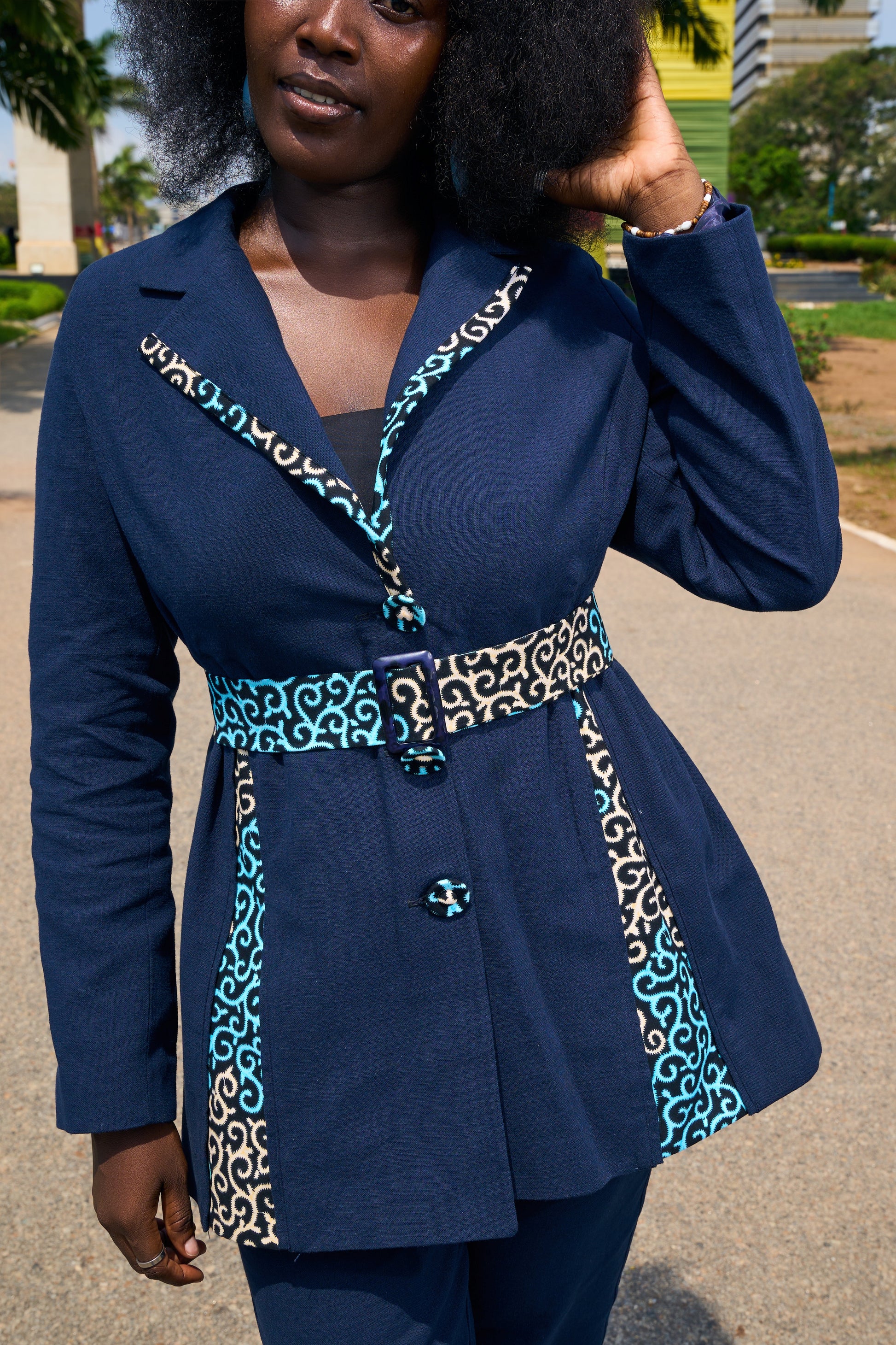 This isn't just a suit; it's a statement. Our Blue Suit is a symbol of elegance. Meticulously tailored in a rich navy blue, this suit features stunning African print details on the lapels and belt, adding a powerful pop of culture to a timeless silhouette.