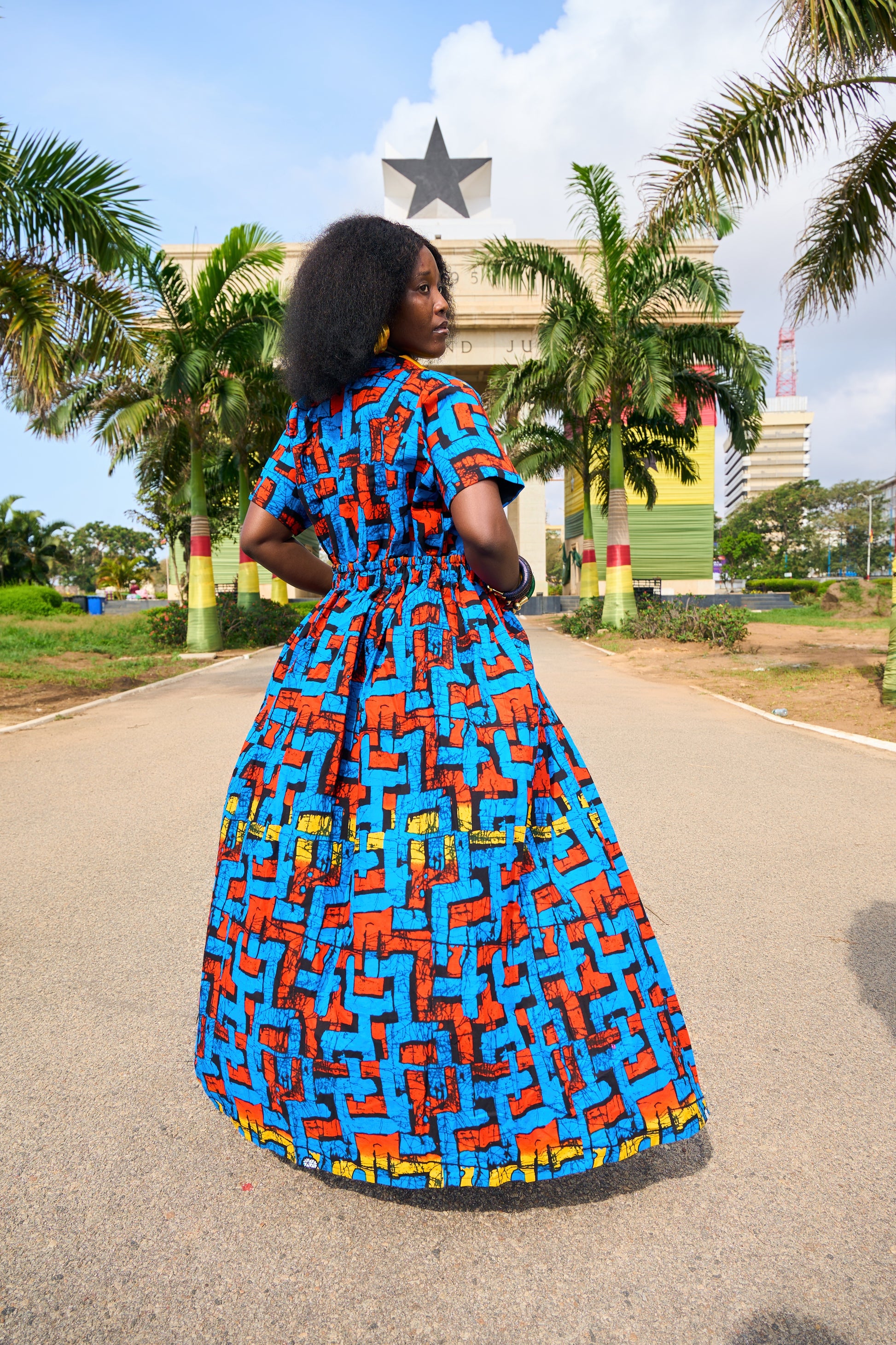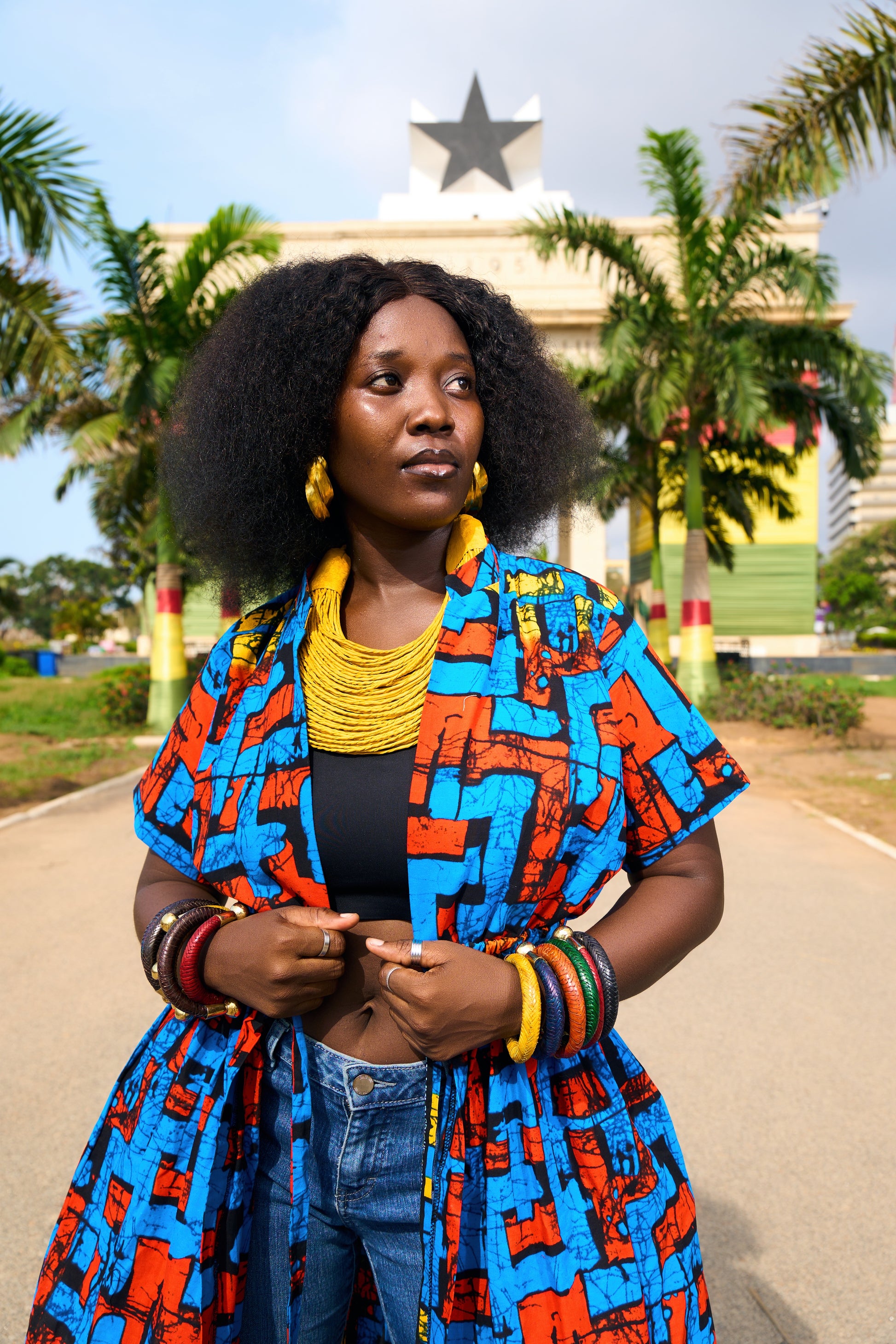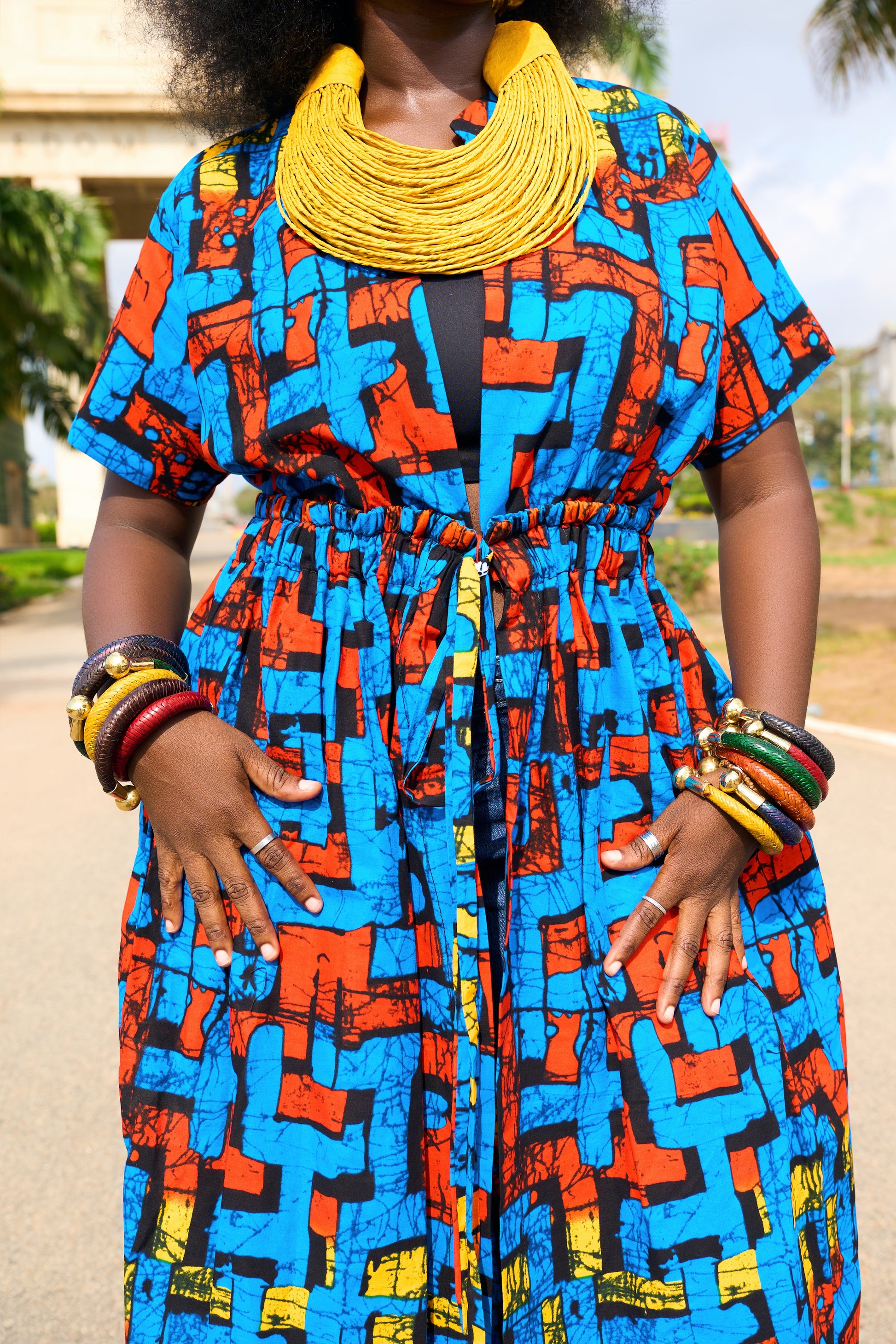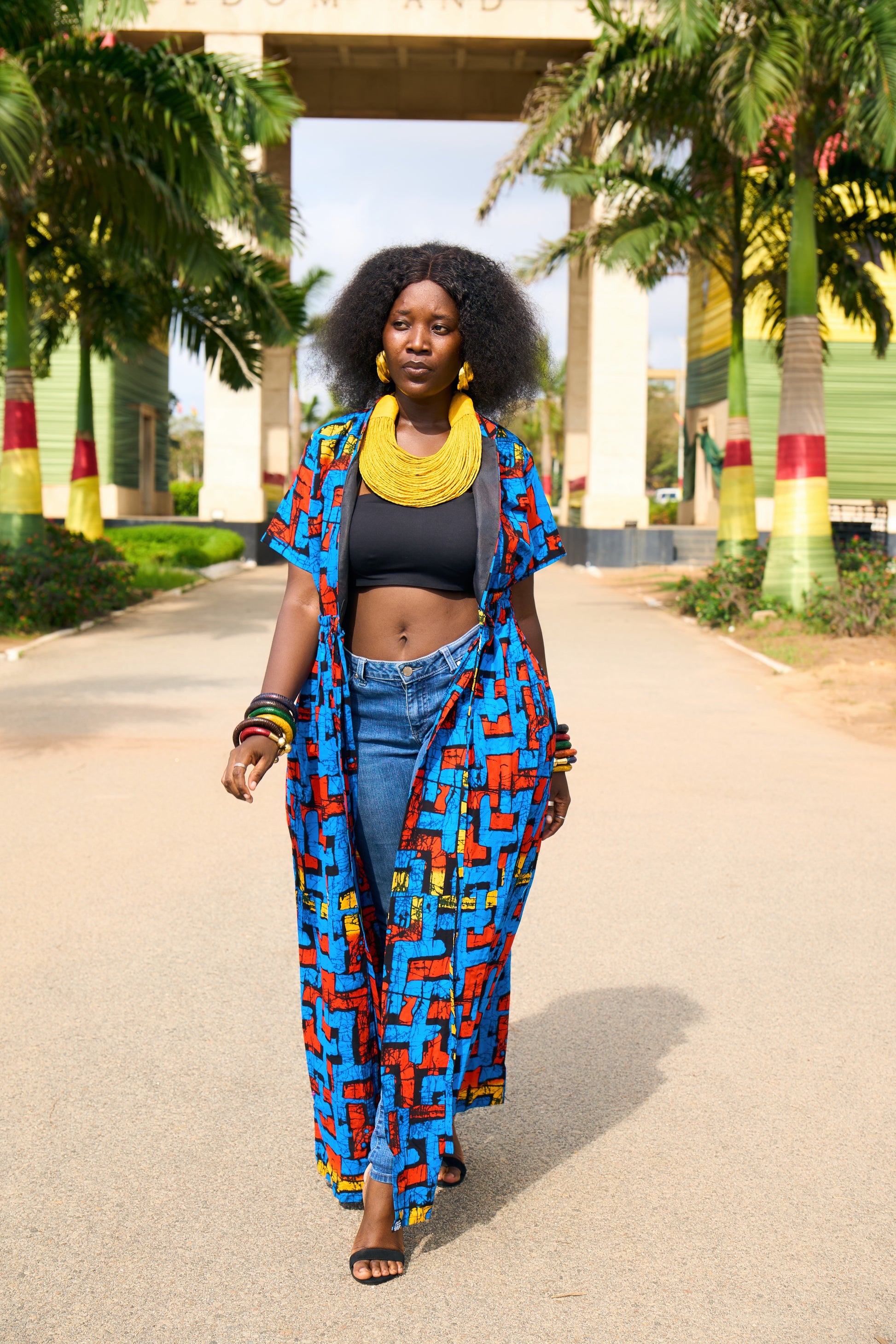 Make your entrance unforgettable, Queen! The Annateiko Blue Duster is a stunning, handcrafted piece designed to elevate every look with its vibrant Ghanaian-inspired print. Its flowing silhouette and bold blues make it an incredibly versatile essential – perfect for layering over jeans, a chic dress, or even as elegant resort wear. This is your signature statement, celebrating your unique style and radiant presence.