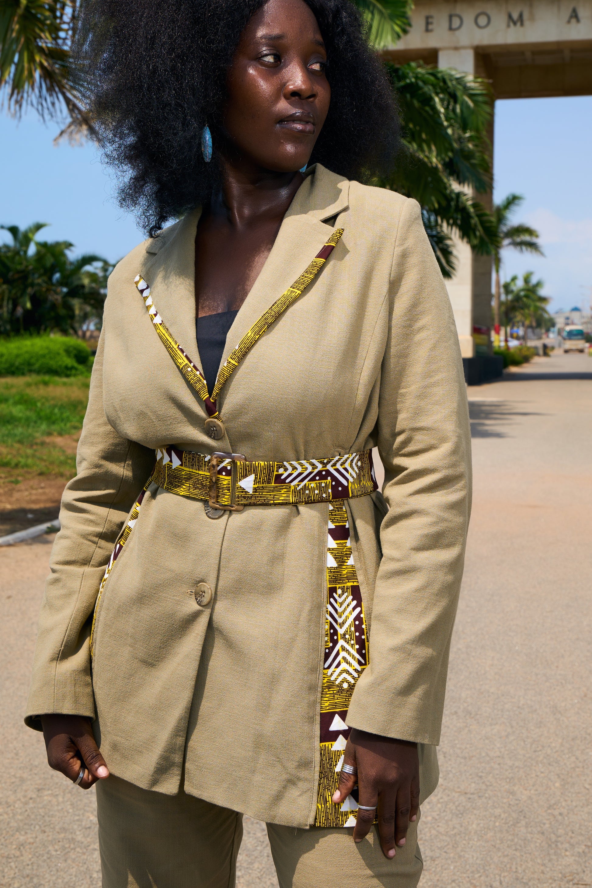 This is the definition of quiet power. Our Tan Suit is a beautiful fusion of timeless elegance and bold heritage. Meticulously tailored in a rich tan, this suit features stunning African print details on the lapels and belt, adding a powerful touch of culture to a classic silhouette.